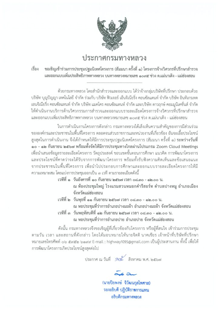ประกาศกรมทางหลวง เรื่องขอเชิญร่วมการประชุมปฐมนิเทศโครงการ (สัมมนา ครั้งที่ 1)