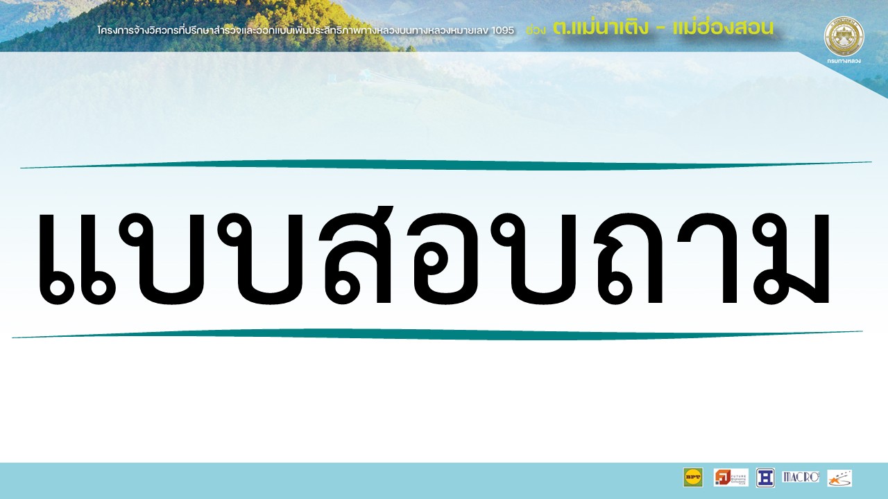 โครงการจ้างวิศวกรที่ปรึกษาสำรวจและออกแบบเพิ่มประสิทธิภาพทางหลวง บนทางหลวงหมายเลข 1095 ช่วง ต.แม่นาเติง – แม่ฮ่องสอน อ่านต่อ >
